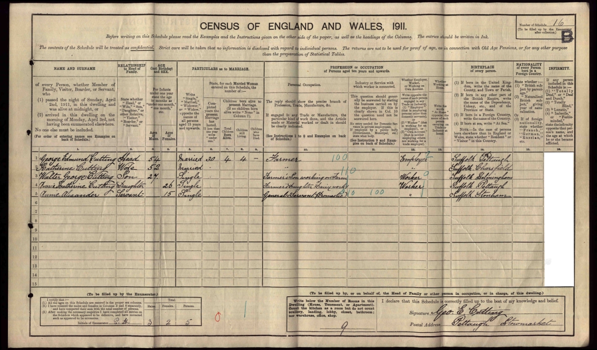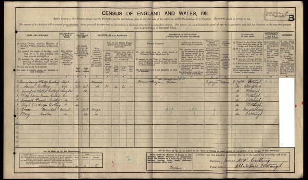 The 1911 census for England and Wales was taken on the night of Sunday 2 April, 1911 -- in every city, town and village, including Pettaugh. It was the first census to be completed by the householder who had to provide names, ages and occupations of the inhabitants, plus the length of marriage, the number of children of that marriage, how many of those children were still living and how many had died.