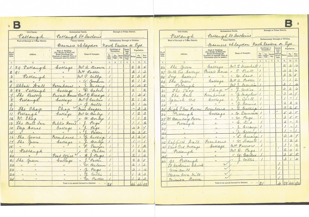 Pettaugh in 1911 - A spreadsheet created in 2011 from all the original 1911 census sheets, showing each of the 46 households in Pettaugh: